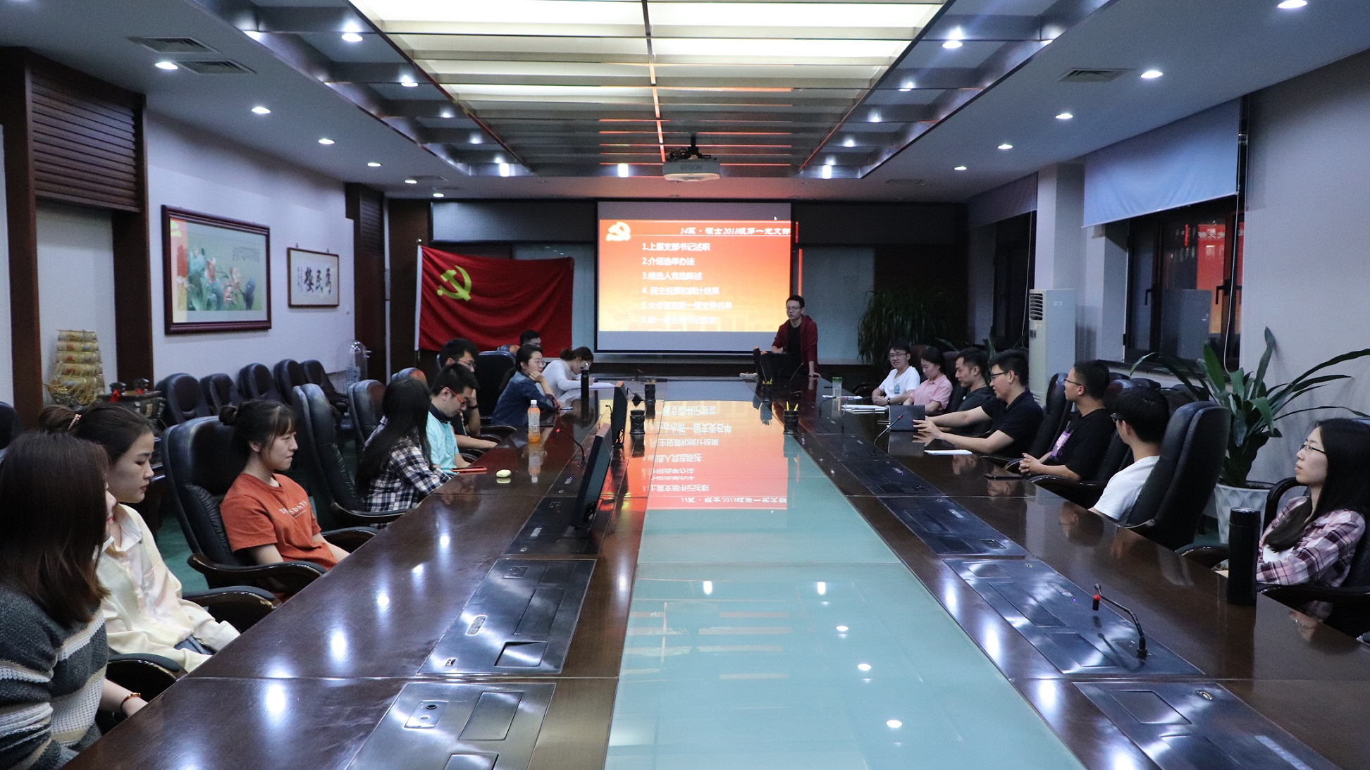 2019年9月19日晚19:30硕士2018级第一党支部在为民楼620举行党支部换届会议,党支部共有20人,参会并有选举和被选举权的有16人,大会由王庆学同志主持。