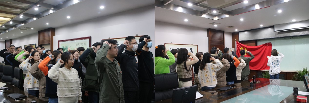 支部书记刘佳带领全体党员重温入党誓词,党员们面对党旗庄严宣誓,短短入党誓言,句句铿锵有力,在场的全体党员以饱满的激情和声音传达出了身为共产党员的自豪感与使命感。