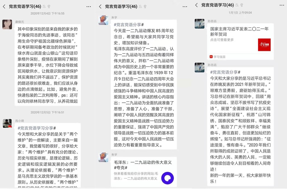 为提高支部理论知识学习水平,支部创建微信学习群,引导党员读懂理论“金句”,将党言党语念在口中,记在心里。支部党员、积极分子共同加入,在政治生日月内,采用轮流领学的方式共同加强理论知识的学习,支部成员和积极分子积极分享党的理论知识、精选讲话与时政热点,互相交流,共同进步,铸就共产党人的政治本色。