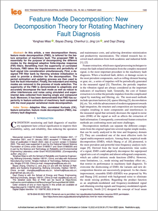 近日,IEEE工业电子学会奖项和荣誉委员会(IEEE Industrial Electronics Society,IEEE IES)发来贺电,我院苗永浩副教授作为第一作者,林京教授作为通讯作者发表在国际顶级期刊IEEE Transactions on Industrial Electronics(IEEE TIE)的论文“Y. Miao, B. Zhang, C. Li, J. Lin, D. Zhang, Feature Mode Decomposition: New Decomposition Theory for Rotating Machinery Fault Diagnosis, IEEE Transactions on Industrial Electronics, 70 (2023) 1949-1960.”荣获2024年IEEE TIE杰出论文奖(IEEE Outstanding Paper Award for the IEEE Transactions on Industrial Electronics),并受邀参加2024年11月在美国芝加哥举办的第50届IEEE工业电子学会年会IECON 2024颁奖仪式。