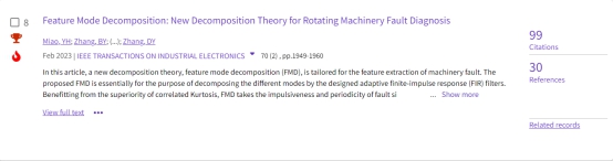 该获奖论文建立了一种新的机械信号特征模式分解理论。信号分解方法是机械故障诊断常用的手段,现有信号分解方法较少针对机械故障诊断专门设计,其分解目标很少针对机械故障特征,因而难以实现故障信息的自适应分解。为此,作者以能衡量机械故障周期性冲击特征的相关峭度作为分解目标,借助自适应滤波原理,提出了全新的特征模式分解理论,在装备故障诊断中得到验证和广泛应用。截止发稿,该论文在Web of Science上引用达到99次,为ESI热点论文。