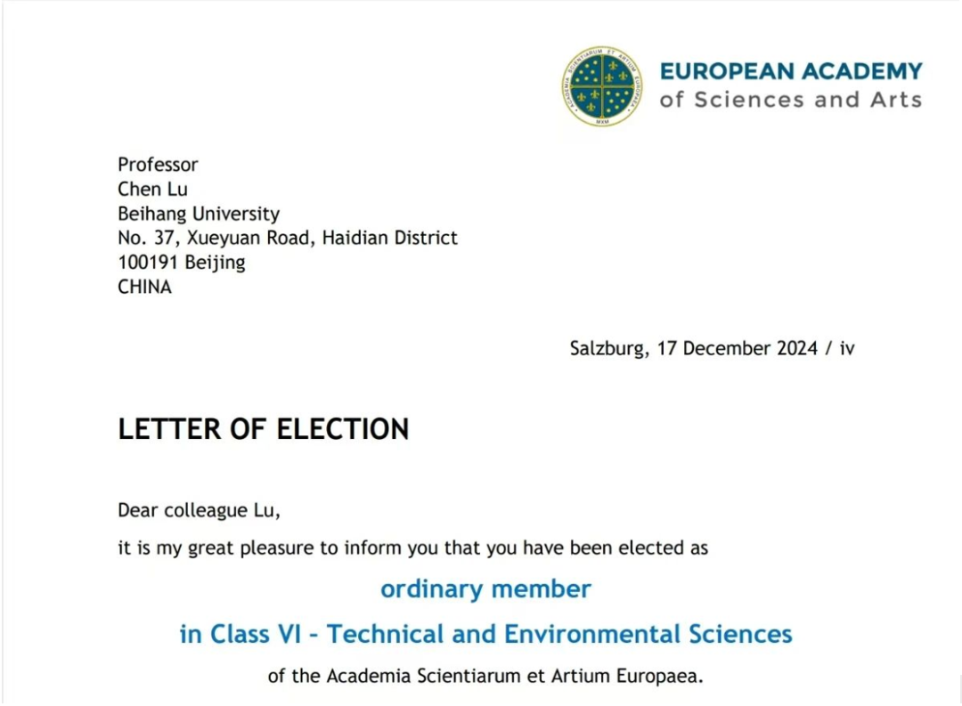 冬至将至,寒意渐浓,北航可靠性与系统工程学院喜事连连,迎来令人振奋的喜讯。12月17日,学院工程技术中心吕琛教授,以其在装备故障诊断与健康管理领域的理论和应用研究方面的杰出贡献,当选欧洲科学与艺术院(European Academy of Sciences and Arts)院士(技术与环境科学学部)。这是吕琛教授继今年5月当选英国皇家航空学会(Royal Aeronautical Society)会士(RAeS Fellow)后,获得的又一项荣誉。